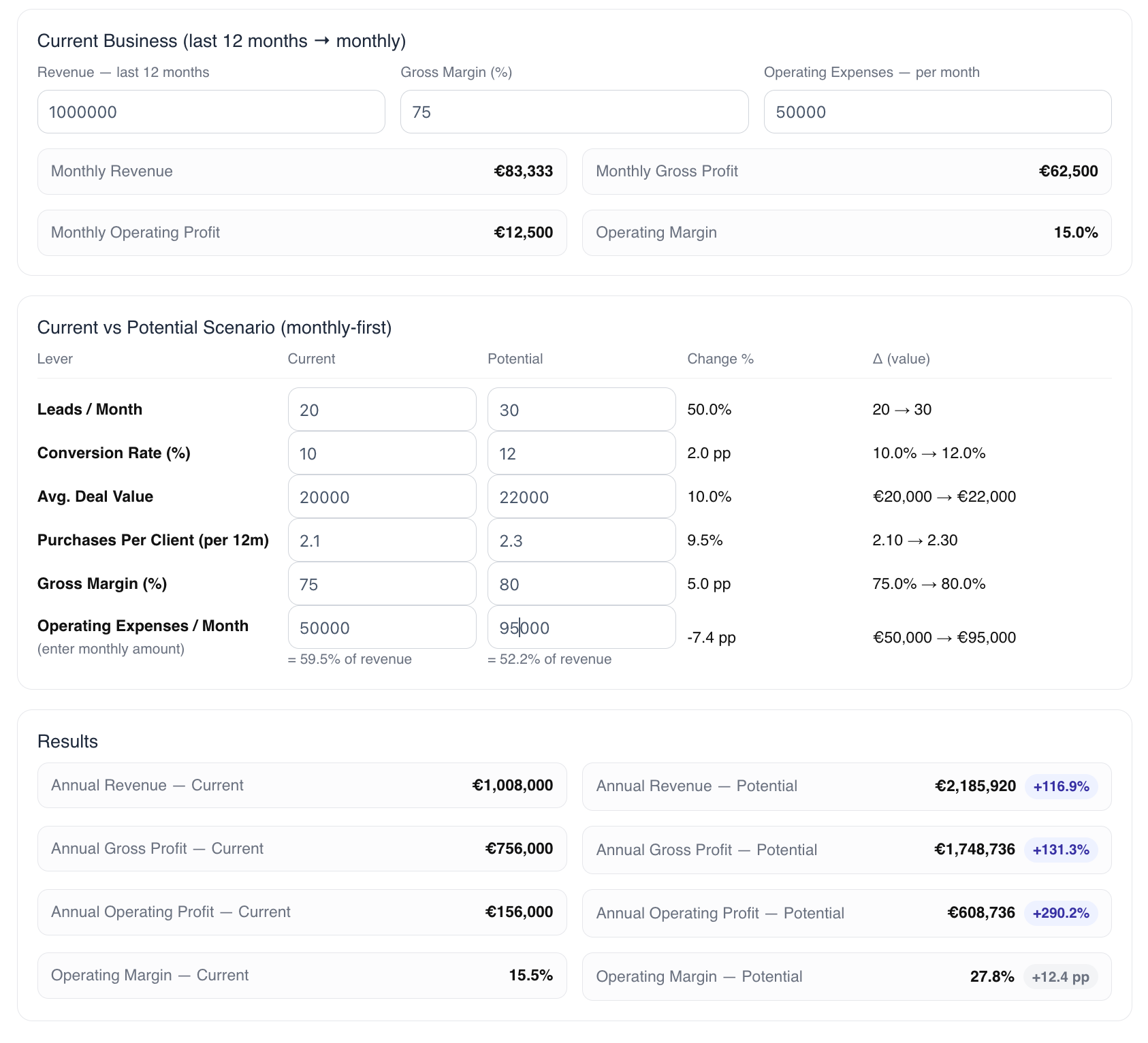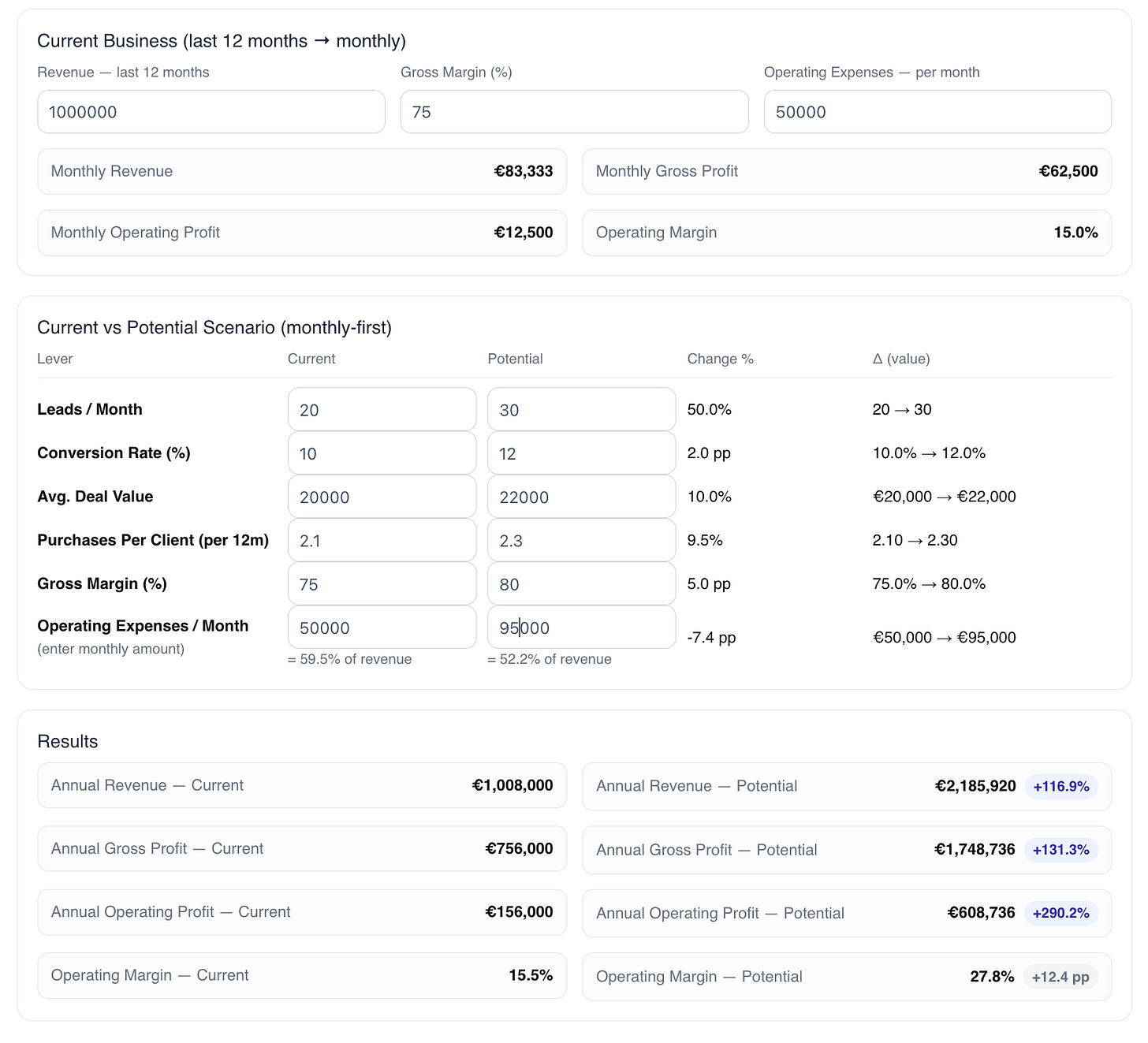 It lets you plug in your current numbers, experiment with small changes across the six levers, and instantly see the impact on your revenue and profit.